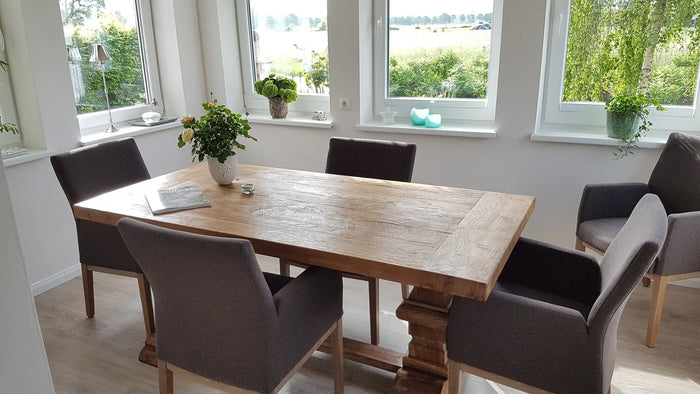 Our monastery table from Souren Furniture is more than just a table; it's a focal point in our home. The aged teak exudes history, strength, and an incredible ambiance. When we have visitors, everyone just wants to sit at the monastery table.