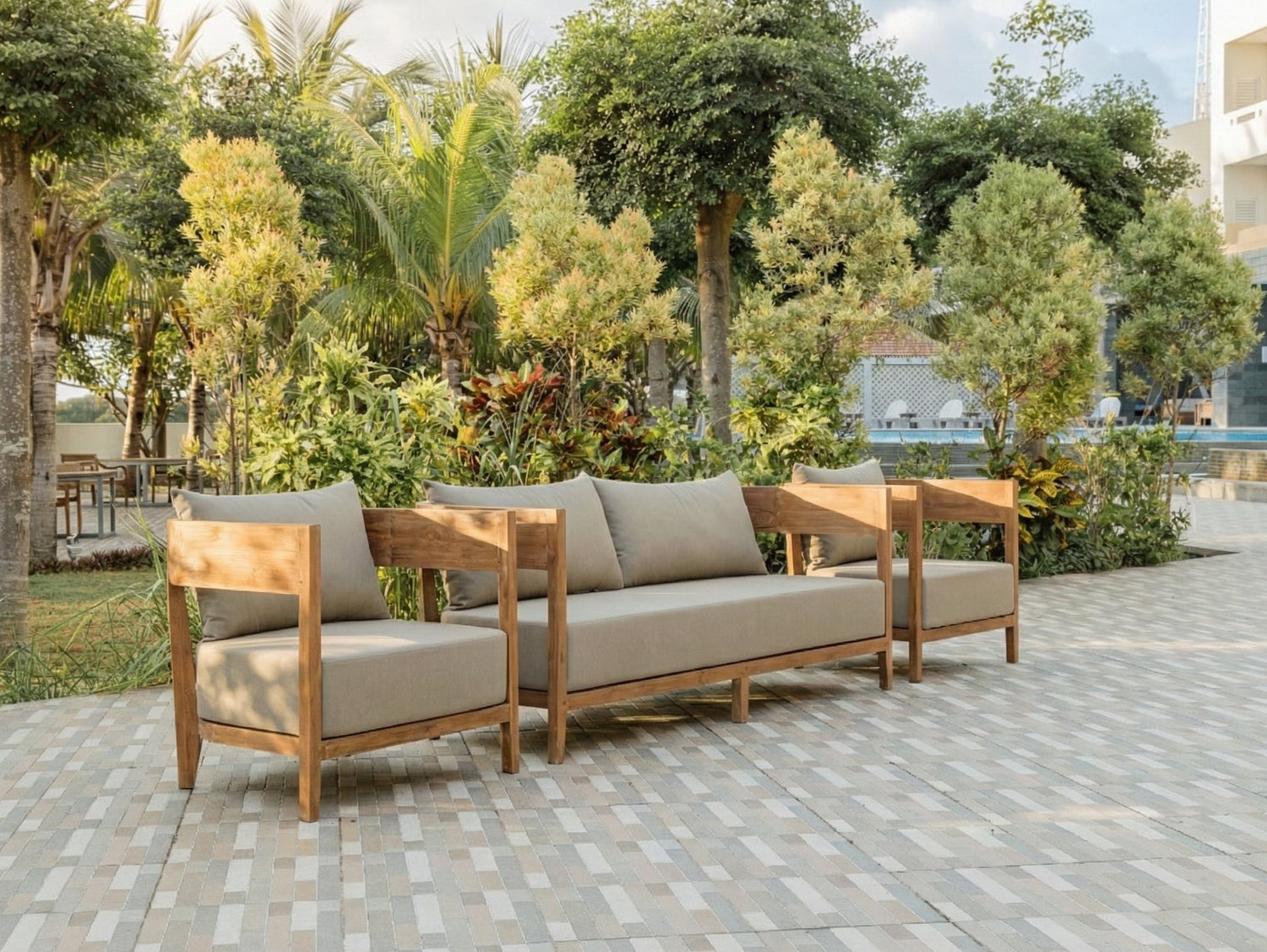 The set is available in two stylish colour variants, both of which harmonise perfectly with the natural teak wood: