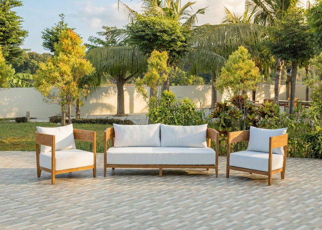 The Lura Lounge Set is the perfect choice for those who value quality, style and longevity. This elegant set consists of a generous 188 cm long lounge sofa and two comfortable armchairs – all crafted from solid teak wood. Ideal for your garden, patio or veranda.